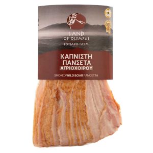 Pancetta of Indigenous Greek Black Pig of Olympus special fed with olive, smoked in beech wood, cut into slices. It is dipped in a seasoning mixture, creating a particularly tasty and slightly spicy crust. It stands out for its wonderful taste and delicate aromas. The quick solution for a delicious meal with the guarantee of Fotiadis Farm.